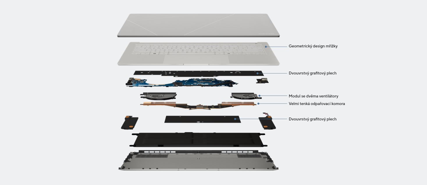 Zenbook S 14 nabízí tichý a efektivní výkon, který se plynule přizpůsobí jakémukoli úkolu. Jeho pokročilý systém chlazení - se dvěma ventilátory, ultratenkou odpařovací komorou a geometrickou mřížkou - umožňuje optimální TDP 28 wattů bez omezování výkonu i při vysokém zatížení. Současně si díky technologii ambient cooling zachovává hlučnost pod 25 dB při nízkém zatížení.