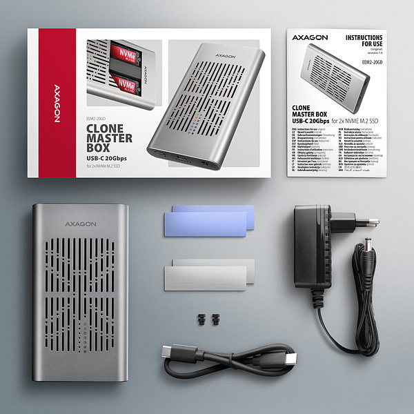 AXAGON EEM2-20GD, USB-C 20Gbps externí box pro dva M.2 NVMe SSD s funkcí klonování