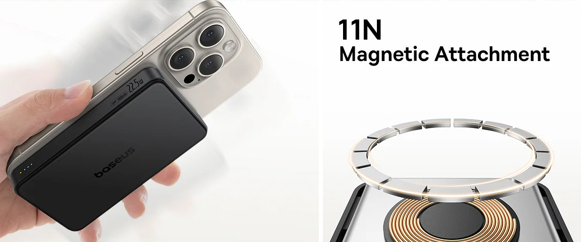 Díky integrovanému magnetickému uchycení (11N) se powerbanka pevně přichytí ke kompatibilnímu zařízení – ideální zejména pro iPhony.