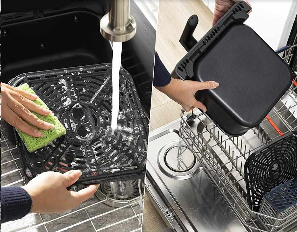 Vyjímatelný fritovací koš a nádoba jsou vyrobeny z odolného, nepřilnavého a zdravotně nezávadného materiálu (BPA a BFOA FREE) a lze je mýt v myčce. Vždy chladná rukojeť a tlačítko pro uvolnění koše eliminují riziko popálení a nechtěného uvolnění.