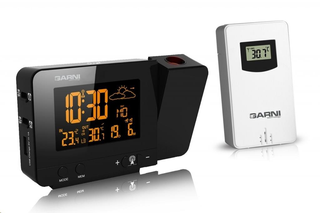 Meteorologická stanice se špičkovým inverzním barevným VA displejem s časem řízeným rádiovým signálem DCF-77, budíkem, měřením vnitřní teploty, bezdrátovým čidlem pro měření vnější teploty a projekcí času a vnitřní / venkovní teploty inverzní barevný VA displej o rozměrech 63 x 42 mm s možností stálého osvětlení při napájení síťovým adaptérem, nebo krátkodobým osvětlením na 15 s při napájení bateriemi 3 stupně jasu osvětlení displeje, možnost vypnutí osvětlení displeje s možností krátkodobého osvětlení na 15 s (při napájení síťovým adaptérem) lze nastavit až 70 barev displeje, nebo režim automatického plynulého střídání barev možnost rychlé volby 8 barev osvětlení displeje velikost číslic na displeji – čas 22 mm, datum, vnitřní a vnější teplota 10 mm, zkratka názvu dne 7 mm čas a datum řízené signálem DCF-77 s možností manuálního nastavení ikona příjmu signálu DCF-77 zkratka názvu dne 12ti, nebo 24 hodinový formát zobrazení času možnost nastavení časového pásma od -1 do +2 hodin budík s 2 budícími časy s funkcí opakovaného buzení (Snooze) po 5 minutách budící signál - 20 sekund 1 pípnutí za sekundu, 20 sekund 2 pípnutí za sekundu, 20 sekund 4 pípnutí za sekundu a poté stálé pípání střídavá projekce času a vnitřní a vnější teploty (teploty se střídají co 5 s) s možností otočení obrazu o 180°, možnost sklopení tubusu projektoru o 90° dopředu a dozadu barva projekce červená stálá projekce při napájení síťovým adaptérem s možností vypnutí 6 animovaných ikon předpovědi počasí (slunečno, polojasno, oblačno, srážky, silný déšť a sněžení) na základě sledování barometrického tlaku vestavěným barometrickým čidlem možnost nastavení výchozí ikony předpovědi počasí zobrazení hodnot vnitřní a vnější teploty paměť na maximální a minimální naměřené hodnoty teploty s automatickým mazáním v 0:00 hodin šipky tendence vývoje barometrického tlaku, vnitřní a vnější teploty indikace námrazy vnější teploty v rozsahu od -1°C do +3°C ikonou na displeji zobrazení teploty ve °C, nebo °F možnost použití až 3 bezdrátových čidel GARNI 029 (jedno čidlo GARNI 029 je součástí dodávky) bezdrátový přenos hodnot vnější teploty na frekvenci 433 MHz ikona příjmu signálu bezdrátového čidla USB port pro nabíjení mobilních zařízení (pouze při napájení hlavní jednotky síťovým adaptérem), maximální nabíjecí proud 1 000 mA ikony slabých baterií napájení síťovým adaptérem, nebo bateriemi možnost postavení barva černá Bezdrátové čidlo GARNI 029 vlhkosti odolné displej o rozměrech xxxxxx mm velikost číslic na displeji: teplota xxxxxx mm měření teploty 3 kanály maximální RF výkon 10 dBm (10 mW) možnost postavení a zavěšení barva bílá Obsah balení: 1 x hlavní jednotka GARNI 365 Arcus 1 x bezdrátové čidlo GARNI 029 1 x síťový adaptér český, slovenský, německý, anglický, italský, polský a maďarský návod.