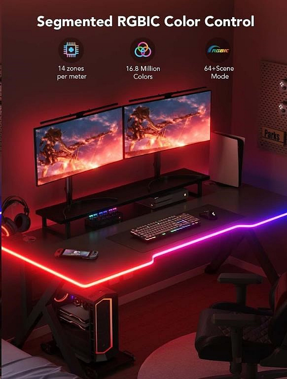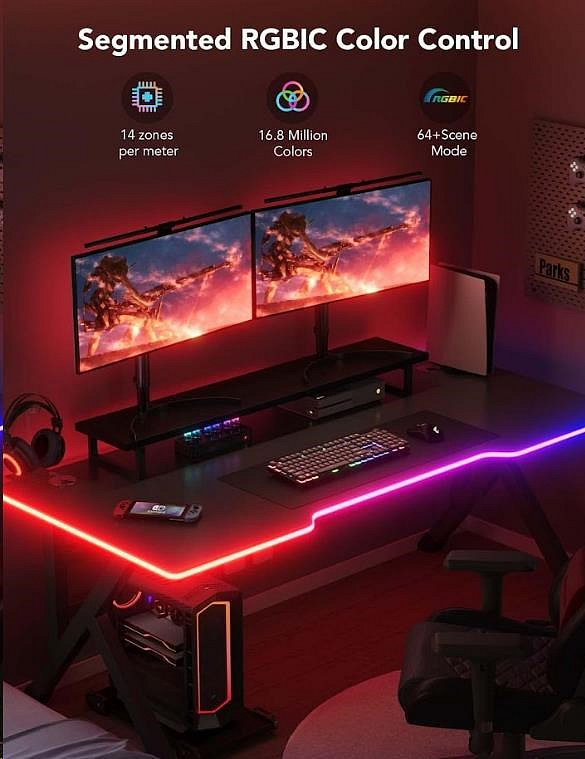 Světelný pásek Govee Neon Gaming Table Light nabízí více než 64 různých režimů pro dokonalé naladění světelné atmosféry. Govee technologie RGBIC umí zobrazit až 57 barev najednou z celkové škály 16 milionů barev při intenzitě 1-100%. Může se také pochlubit životností až 50.000 hodin.