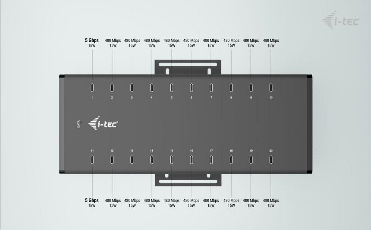 Tento moderní HUB nabízí 20 USB-C s funkcí Plug & Play a nabíjením až 15W na port. Díky tomu, že HUB má 20 USB portů, je možno nabíjet až 20 zařízení najednou.