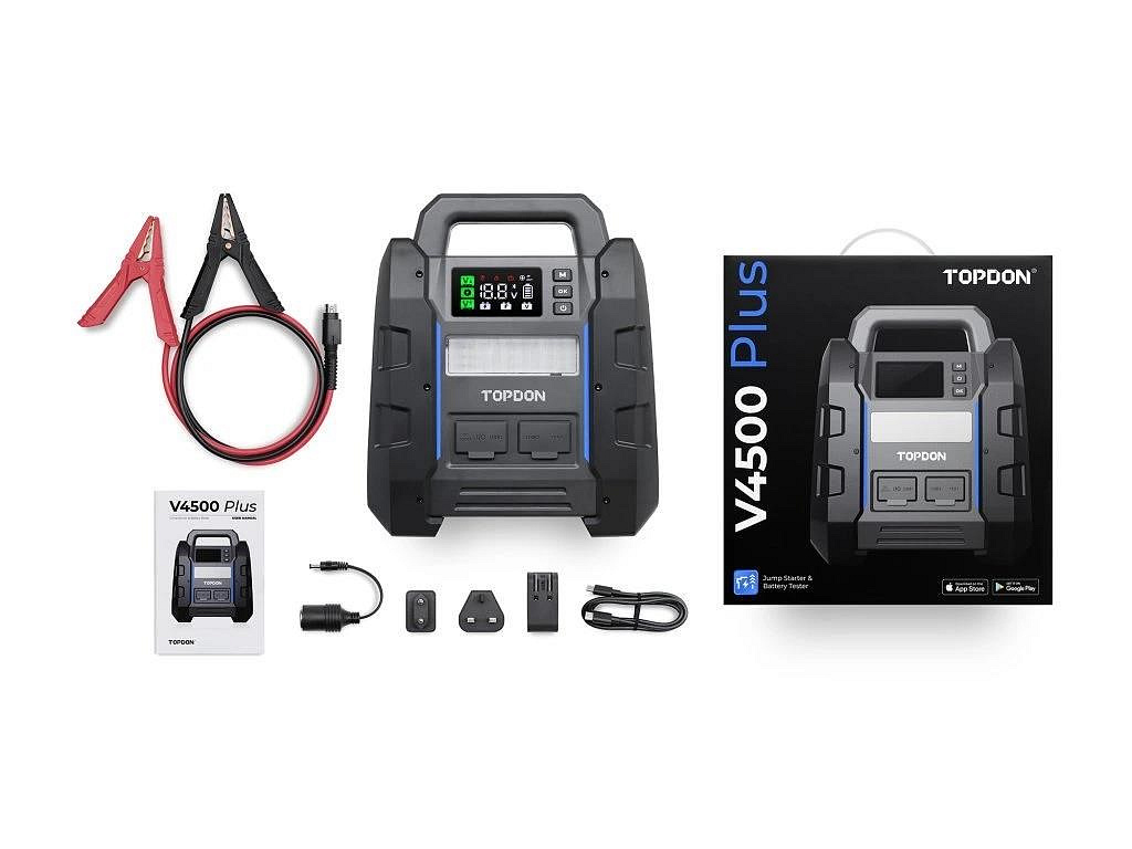 Jump startér TOPDON V4500 Plus nabízí dokonalé řešení napájení pro vozidla s velkým objemem, jako jsou návěsy a přívěsy. Se špičkovým proudem 4500 A je speciálně navržen pro automobily s napětím 12 V a je vhodný pro benzínová a dieselová vozidla s objemem motoru až 16 litrů.