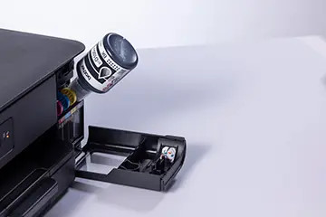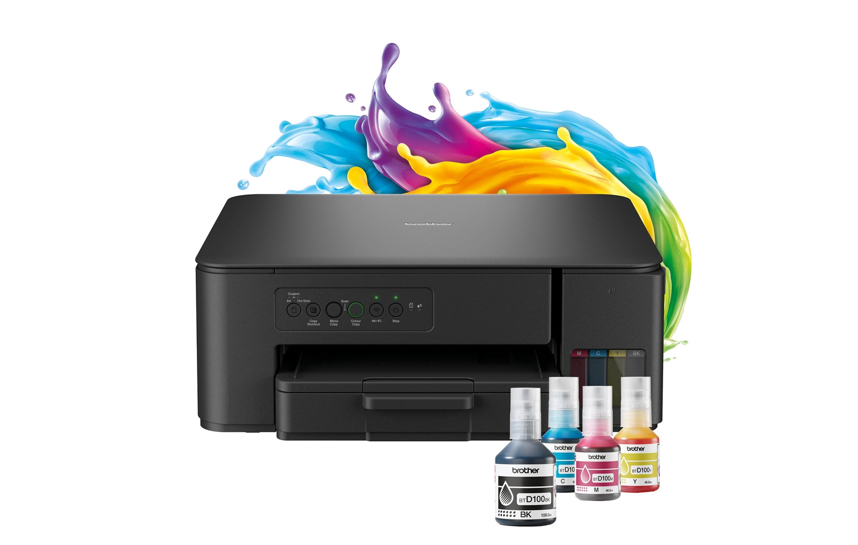 Kompaktní tiskárna DCP-T430W s inkoustovými nádržkami 3 v 1 tiskne déle díky lahvičkám s vysokou výtěžností. Doplňte nádržky rychle a bez držení lahviček – inovativní zámkový systém s klíčem zabrání záměně barev a zajistí správné doplnění.