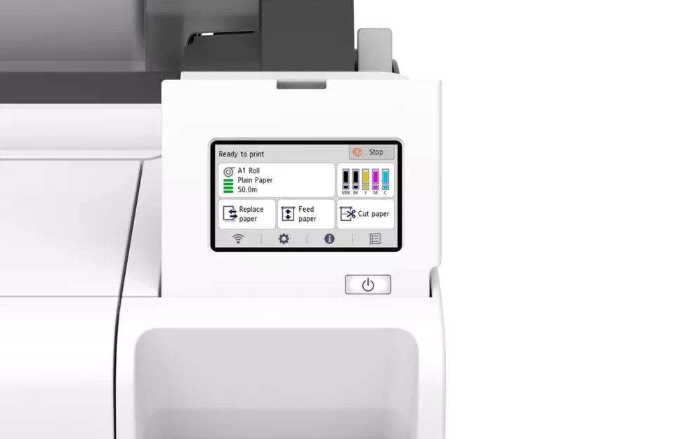 Funkční design panelu dotykové obrazovky s úhlopříčkou 4,3“ umožňuje intuitivní zobrazování pokynů a důležitých informací, jako je typ a zbývající množství média a množství inkoustu. Roli papíru lze snadno vyměnit na horním krytu s plochým povrchem.