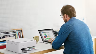 Díky efektivnímu a prostorově úspornému designu mohou být naše domácí tiskárny uloženy na policích nebo stolech, a není nutné, aby byly přístupné zezadu. Užijte si čistší a čitelnější výtisky díky inteligentnímu rozmístění bodů a optimalizaci inkoustu prostřednictvím našeho systému kazet FINE a aktualizovaného pigmentového černého inkoustu. Ať už tisknete jakkoli, užijte si bezproblémový provoz díky stabilnímu dvoupásmovému Wi-Fi připojení (2,4 GHz/ 5 GHz).