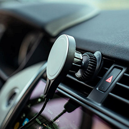Nabíjecí držák do ventilace auta s MagSafe, výkonem 15W a integrovaným USB-C kabelem v délce 1,5 m.
