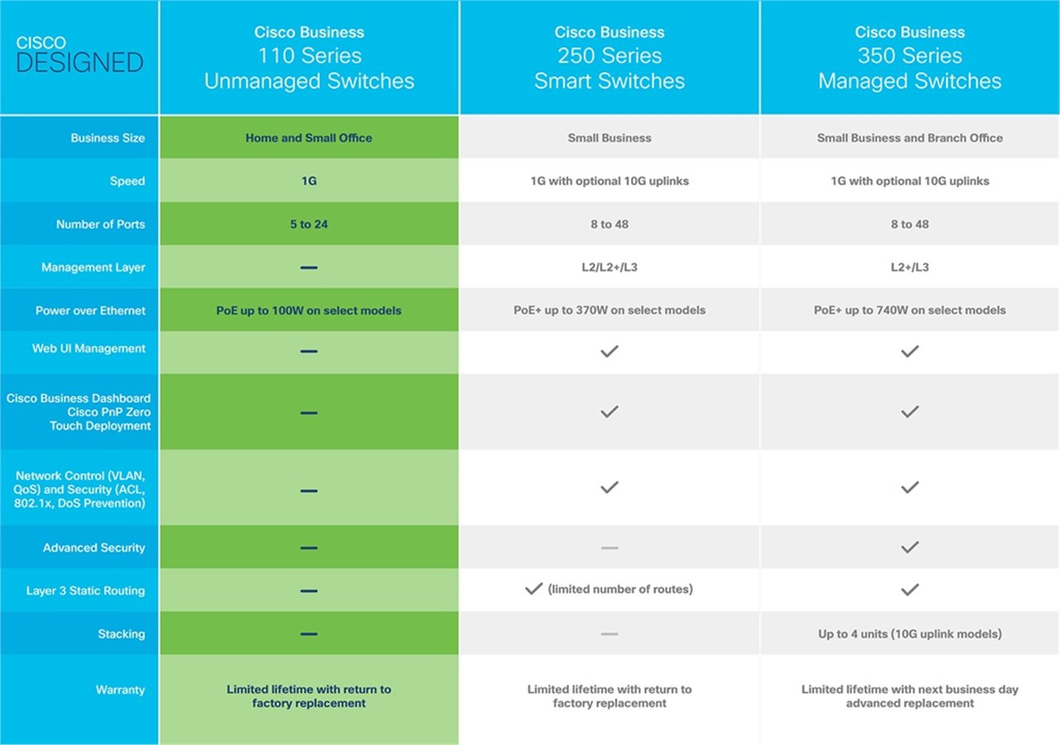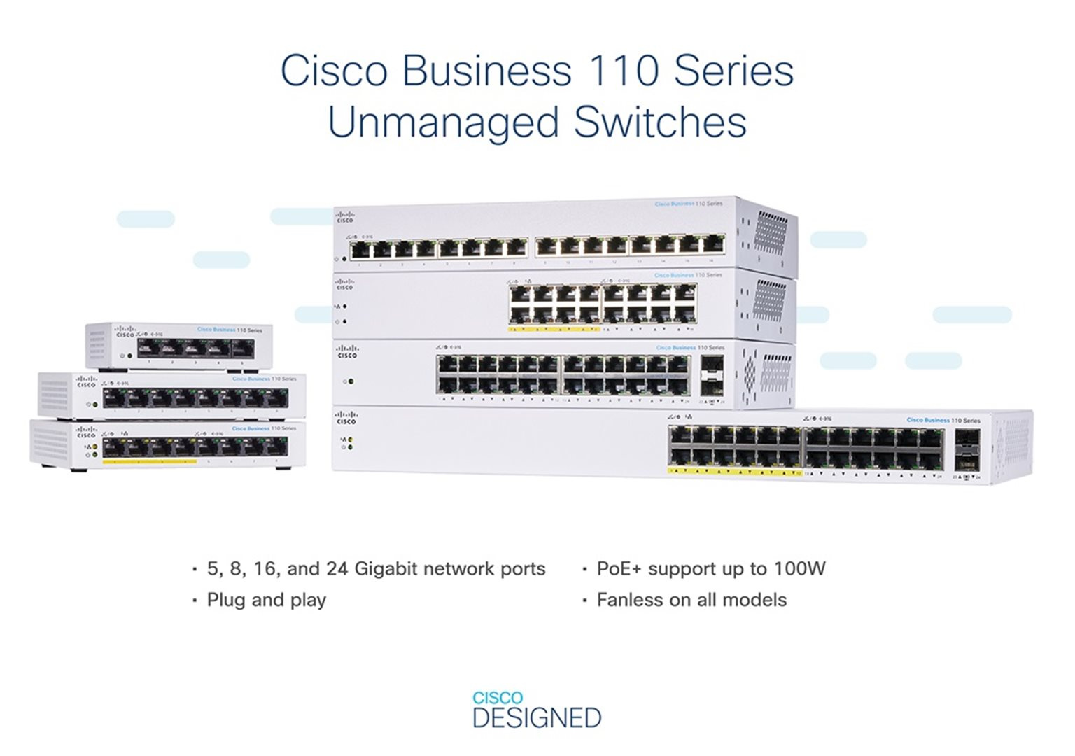 Nyní můžete mít vysoce výkonnou síť podnikové třídy s Cisco Business 110 Series Unamnaged Switches. Tyto cenově dostupné přepínače typu plug-and-play jsou ideální pro malé kanceláře, pracovní skupiny, oddělení a rostoucí kanceláře s omezeným IT know-how a podporou. Poskytují robustní síťové připojení, které splňují vaše obchodní požadavky, a také přidanou spolehlivost s pokročilými funkcemi, jako je Quality of Service (QoS), detekce smyčky a diagnostika kabelů, to vše v přepínači, který si můžete nastavit sami během několika minut. Přepínače řady Cisco Business 110 přinášejí vaší malé firmě osvědčenou spolehlivost a ochranu investic síťových řešení Cisco.