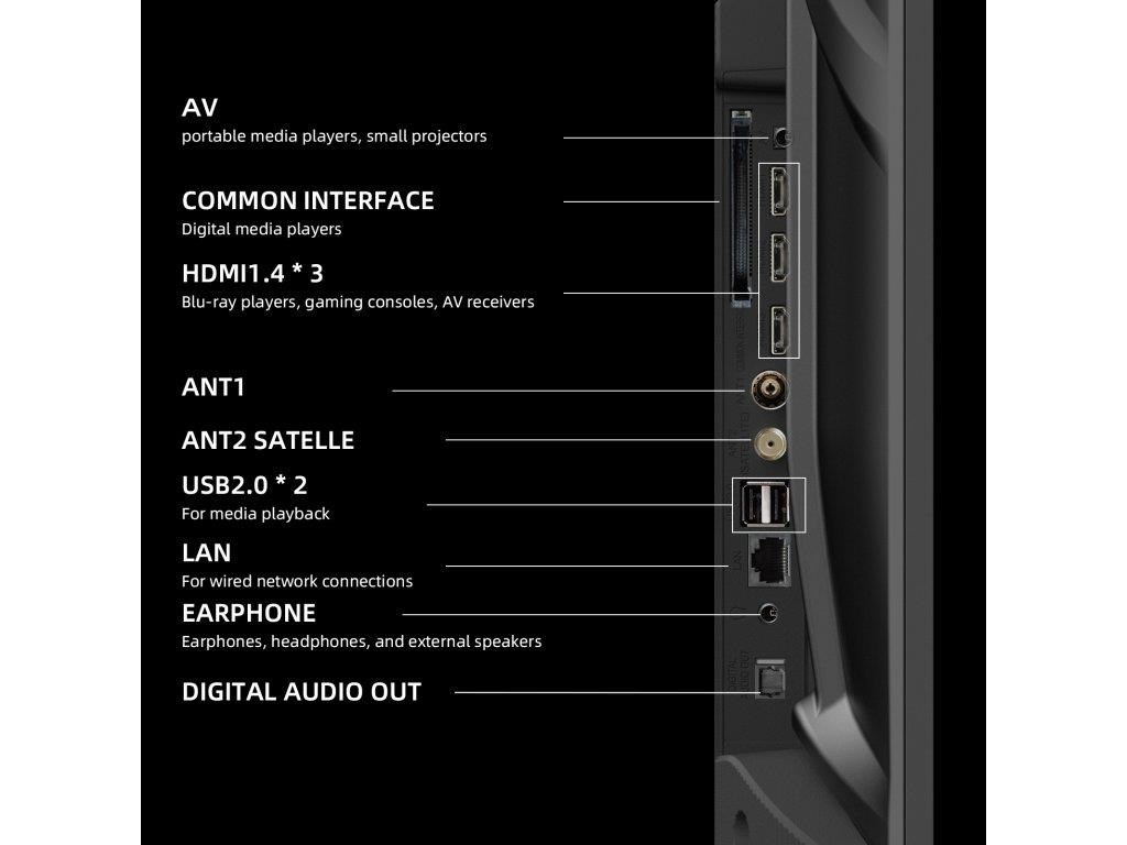 Vstupy a výstupy: | AV vstup mini, CI+, digitální audio výstup, HDMI 2.1, USB 2.0, LAN, antény RF a LNB |