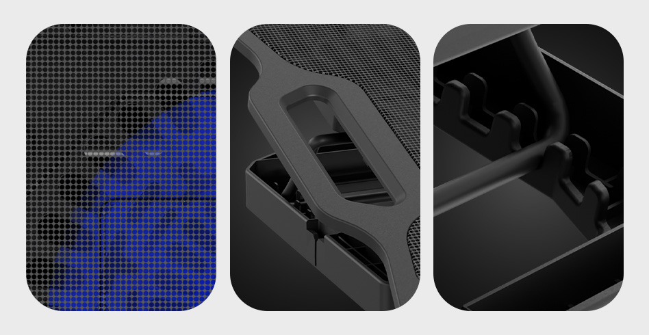 - Kovový přední panel s optimální velikostí ok zvyšuje cirkulaci vzduchu chladicí podložky.