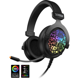 Dominantou tohoto modelu je stylizované RGB podsvícení a velké 50 mm měniče pro hluboké basy. Nechybí ani flexibilní mikrofon a regulace hlasitosti s možností vypnutí mikrofonu přímo na mušli. Samozřejmostí je pozlacený USB konektor. V balení najdete i arch promo samolepek herní řady DOODLE.