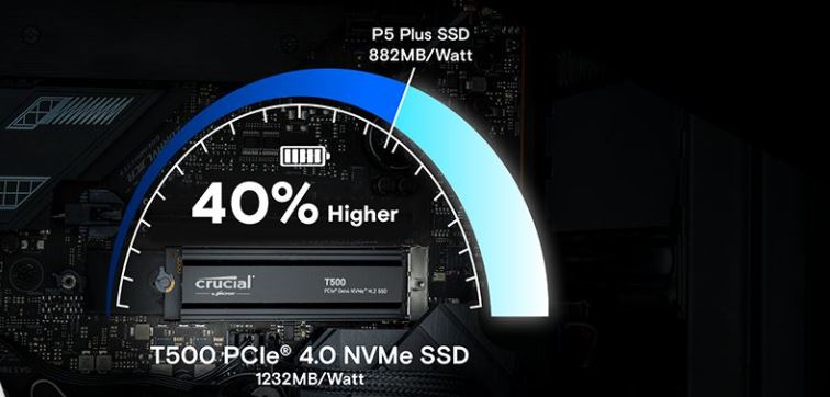 DĂky efektivitÄ› vyuĹľitĂ energie modelu T500 zvládnete vĂce práce za kratšà dobu. DĂky aĹľ o 40 % vyššĂmu pomÄ›ru vĂ˝konu a spotĹ™eby pomáhá SSD Crucial T500 PCle 4.0 NVMe udrĹľet váš poÄŤĂtaÄŤ v provozu rychleji a s nižšà spotĹ™ebou energie.