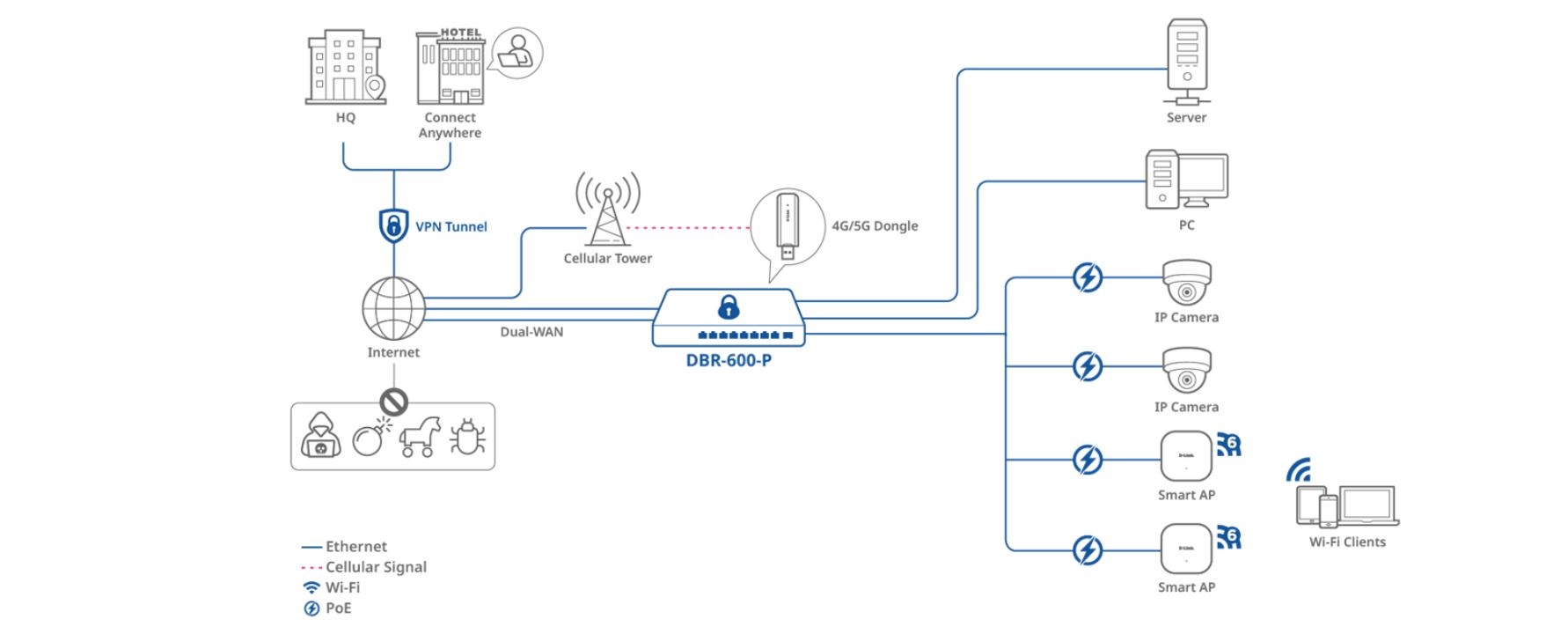 Je ideální pro malé kanceláře a kavárny, obsahuje USB port pro 4G/5G USB modem D-Link, který nabízí flexibilní zálohování internetu. Díky 2Gb/s firewallu a IPsec VPN tunelům zajišťuje bezpečný vzdálený přístup. Integrovaná správa AP a PoE zjednodušuje ovládání bezdrátových přístupových bodů, což z něj činí vynikající volbu pro firmy hledající efektivní a bezpečná síťová řešení.