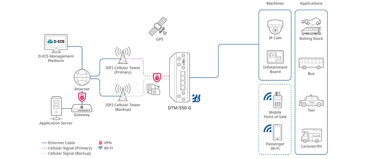 DTM-550-G 5G Transit Gateway vylepšuje pĹ™epravu pomocĂ vysokorychlostnĂho pĹ™ipojenĂ, obsahuje podporu dvou SIM karet pro nepĹ™etrĹľitĂ© mobilnĂ sluĹľby a Wi-Fi 6 pro robustnĂ zážitek z internetu pro cestujĂcĂ. Integrovaná GPS usnadĹuje efektivnĂ správu trasy prostĹ™ednictvĂm pĹ™esnĂ˝ch sluĹľeb zaloĹľenĂ˝ch na poloze. Tato brána je centrálnÄ› spravována pomocĂ D-ECS, coĹľ umoĹľĹuje bezproblĂ©movĂ© vzdálenĂ© monitorovánĂ, ideálnĂ pro autobusy, taxĂky a obytnĂ© vozy. Podporuje kritickĂ© aplikace, jako je Wi-Fi pro cestujĂcĂ, mobilnĂ POS, IP kamery a informaÄŤnĂ a zábavnĂ systĂ©my, coĹľ zajišťuje efektivnĂ provoz a bezproblĂ©movou konektivitu v dynamickĂ˝ch prostĹ™edĂch.