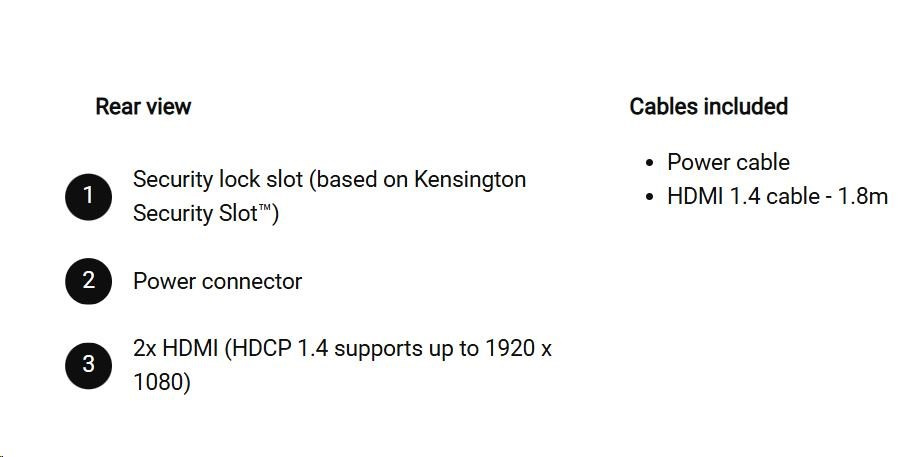 | 2 HDMI port (HDCP 1.4) (Support up to FHD 1920 x 1080 144 Hz as specified in HDMI 1.4) |