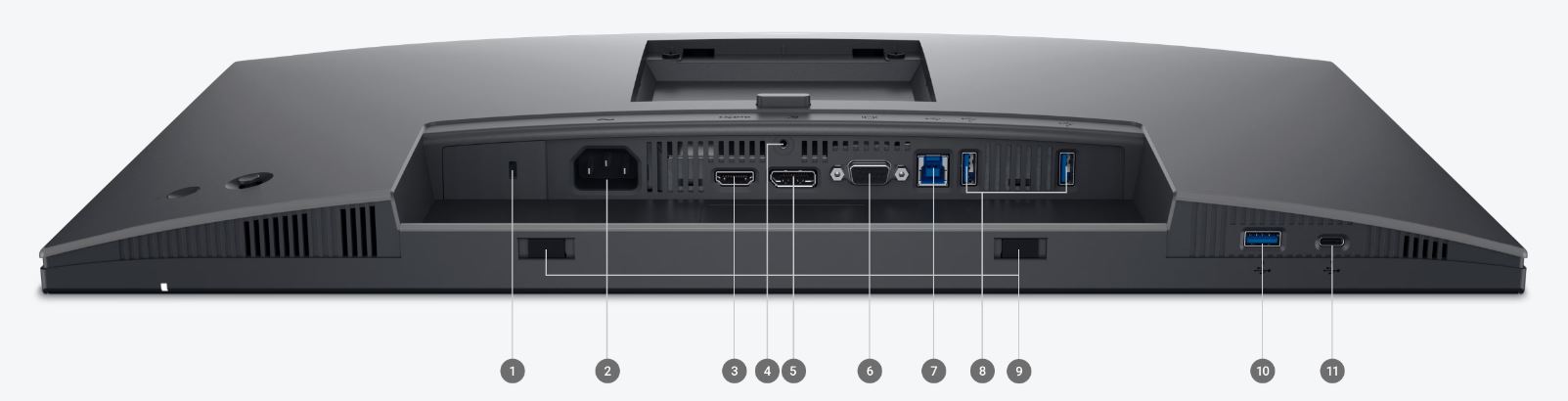 1. Slot pro bezpečnostní zámek (na základě Kensington Security Slot™) | 2. Napájecí konektor | 3. HDMI | 4. Zámek stojanu | 5. DisplayPort 1.2 | 6. VGA | 7. Upstream USB 3.2 Gen 1 typu B | 8. Výstupní porty USB 3.2 Gen 1 typu A (2) | 9. Sloty pro soundbar | 10. USB 3.2 Gen 1 typu A downstream | 11. USB 3.2 Gen 1 Type-C downstream (PD až 15W)