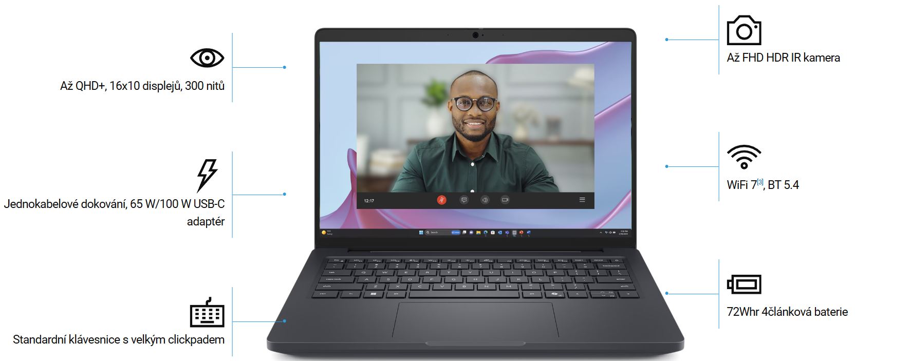 * Displej: 14" FHD+ LCD with 300 nits, Non-touch, FHD RGB Camera, Microphone, WLAN