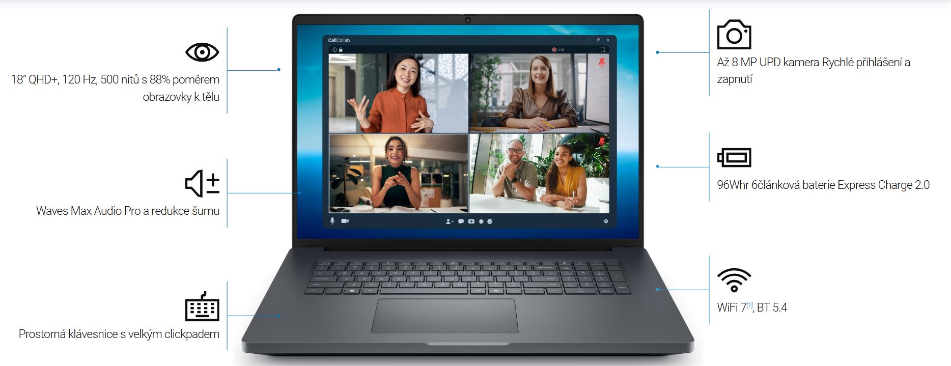 * Displej: 18" QHD+ LCD 2560x1600 with 500 nits, DCI-P3 100%, Non-Touch, WLAN, IR camera, Microphone