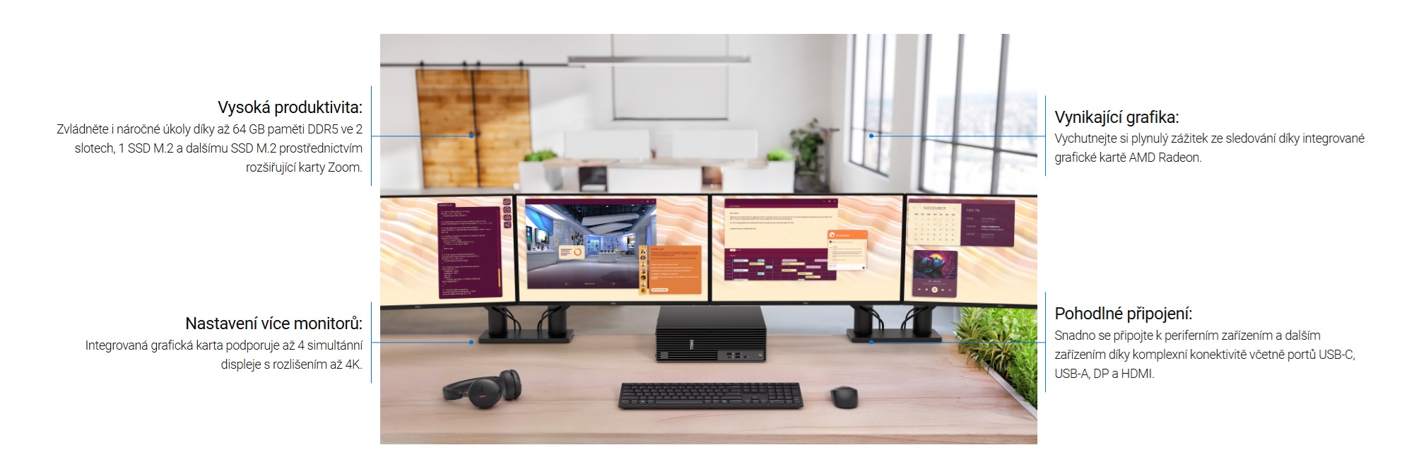 Snadno vylepšete vnitřní komponenty svého stolního počítače díky skříni, kterou lze otevřít bez použití nástrojů, a třem rozšiřujícím slotům PCIe. Mezi volitelné možnosti patří porty DP a HDMI podporující rozlišení až 5K pro vylepšený zážitek ze sledování videa, stejně jako Wi-Fi 7.
