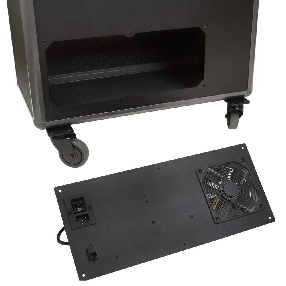 The trolley makes it possible to charge 14 laptops at once, so you remain flexible at all times and don't have to worry about there being no sockets. An adjustable divider allows for the device module to be adapted to notebooks measuring up to 33 × 254 × 380 mm (16 inches) in size. The devices are placed between ABS panels and each given their own place. All power is supplied completely on a removable mounting plate which has its own internal power distribution, is mutually compatible with the GST18 connector, and features a C14 power entry module with an integrated switch and automatically resettable fuse. To protect the devices from overheating, the trolley features a powerful yet quiet fan. Maximum protection is provided by the rugged aluminium and con-pearl construction with built-in lock, the sliding handle, and four high-quality castors for convenient transport. Small items such as power cords can be stored in the pocket on the lid. The charging case comes equipped with country-specific connector strips (internal power distribution, mutually compatible with GST18).