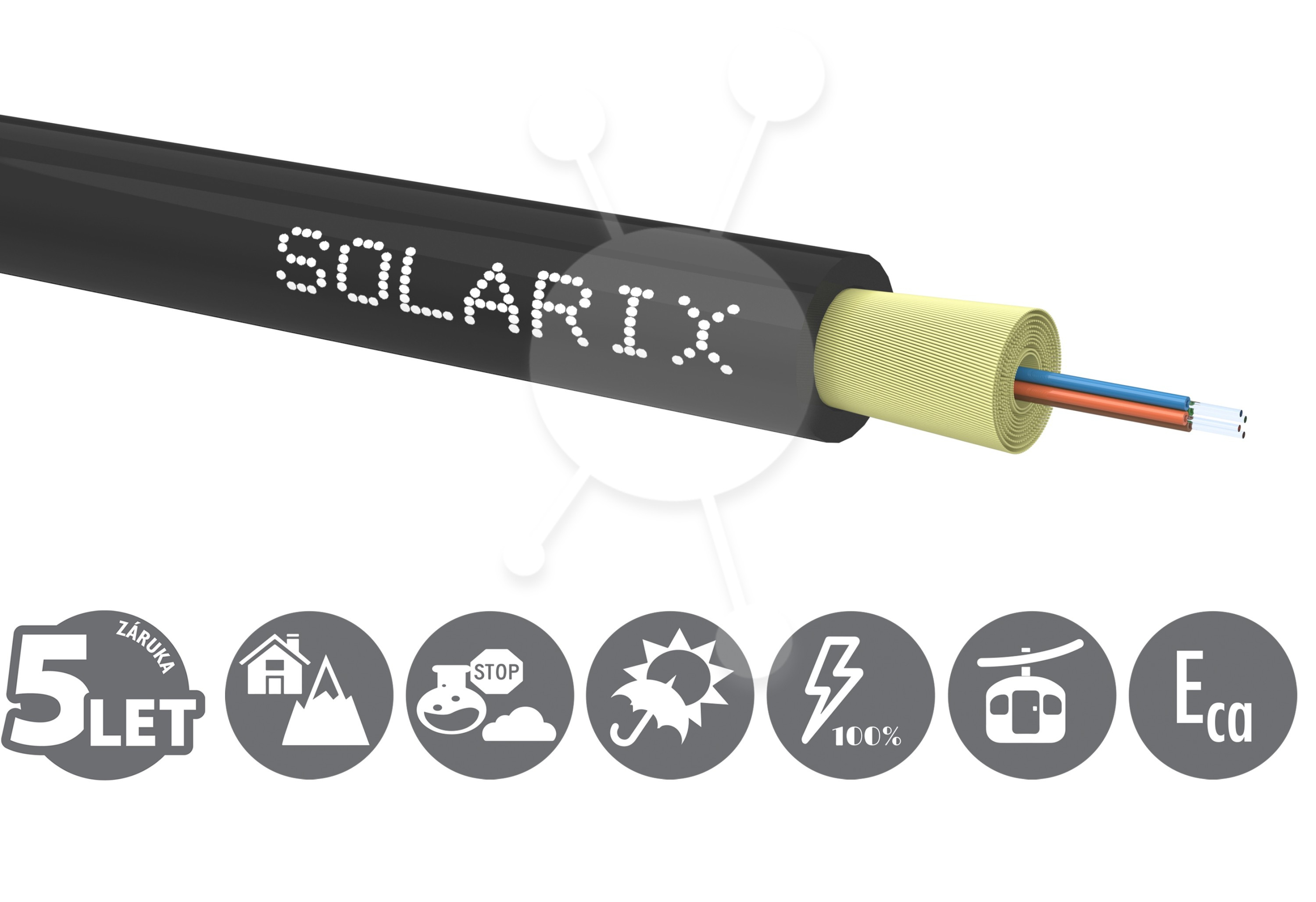 Univerzální optický DROP kabel Solarix je určen pro vnitřní i venkovní instalace (FTTH). Díky své vysoké tahové odolnosti 1000 N a kompaktnímu průměru 3 mm je ideální pro zafukování do trubek, instalaci do lišt nebo pro krátké převěsy. Přenos *Standard: ITU-T G.657.A2 (vlákno se zvýšenou odolností proti ohybu) *Frekvence: Optimalizováno pro vlnové délky 1310 nm, 1550 nm a 1625 nm *Rychlost přenosu: Podpora pro 10G, 40G i 100G Ethernet (v závislosti na aktivních prvcích) Výkon a kapacita *Počet vláken: 4 *Typ vlákna: Single Mode 9/125 µm (vlákno G.657.A2) *Tahová odolnost: 1000 N (krátkodobá) *Útlum: < 0.35 dB/km při 1310 nm, < 0.21 dB/km při 1550 nm *Minimální poloměr ohybu: 15 mm (při instalaci), 30 mm (provozní) Porty a hardware *Vnější průměr: 3,0 mm (± 0,2 mm) *Materiál pláště: LSOH (Low Smoke Zero Halogen) – bezhalogenní, s nízkou kouřivostí *Tahové prvky: Aramidová příze (Kevlar) *Barevné značení vláken: Červená, zelená, modrá, žlutá Režimy provozu *Vnitřní instalace: Bezpečný díky LSOH plášti s nízkou hořlavostí *Venkovní instalace: Odolný vůči UV záření a povětrnostním vlivům *FTTH (Fiber To The Home): Koncové přípojky k účastníkům Zabezpečení *Požární klasifikace: Eurotřída Eca (dle EN 50575) *Ochrana: Odolnost proti vlhkosti a UV záření *Bezpečnost: Dielektrická konstrukce (neobsahuje kovové prvky, nevede elektrický proud) Fyzické parametry *Délka návinu: Standardně na špulkách 1000 m nebo 2000 m *Barva: Černá Provozní podmínky *Provozní teplota: -20 °C až 60 °C *Skladovací teplota: -20 °C až 60 °C *Vlhkost: 5 % až 95 % RH (nekondenzující)Typ:Kabely