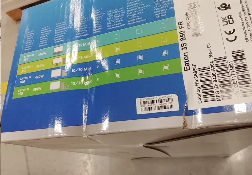 Eaton -Poškozený obal- 3S 850 FR, UPS 850VA / 510W, 8 zásuvek (4 zálohované), USB, 2x USB charge, české zásuvky