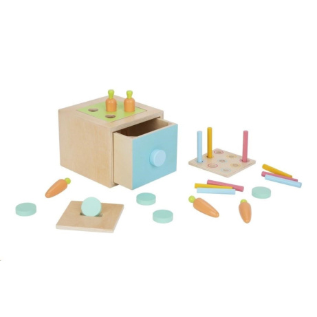 Dřevěná edukační hračka (box), pro děti od 1 roku, představuje hned 3 hračky v jednom. Multifunkční bedýnka (box) s výměnitelným horním dílem je zábavnou vkládačkou s mrkvičkami, s barevnými válečky nebo pokladničkou. Díky 3 výměnitelným destičkám děti mohou hrát různé hry, zdokonalovat své dovednosti a užít si spoustu legrace.