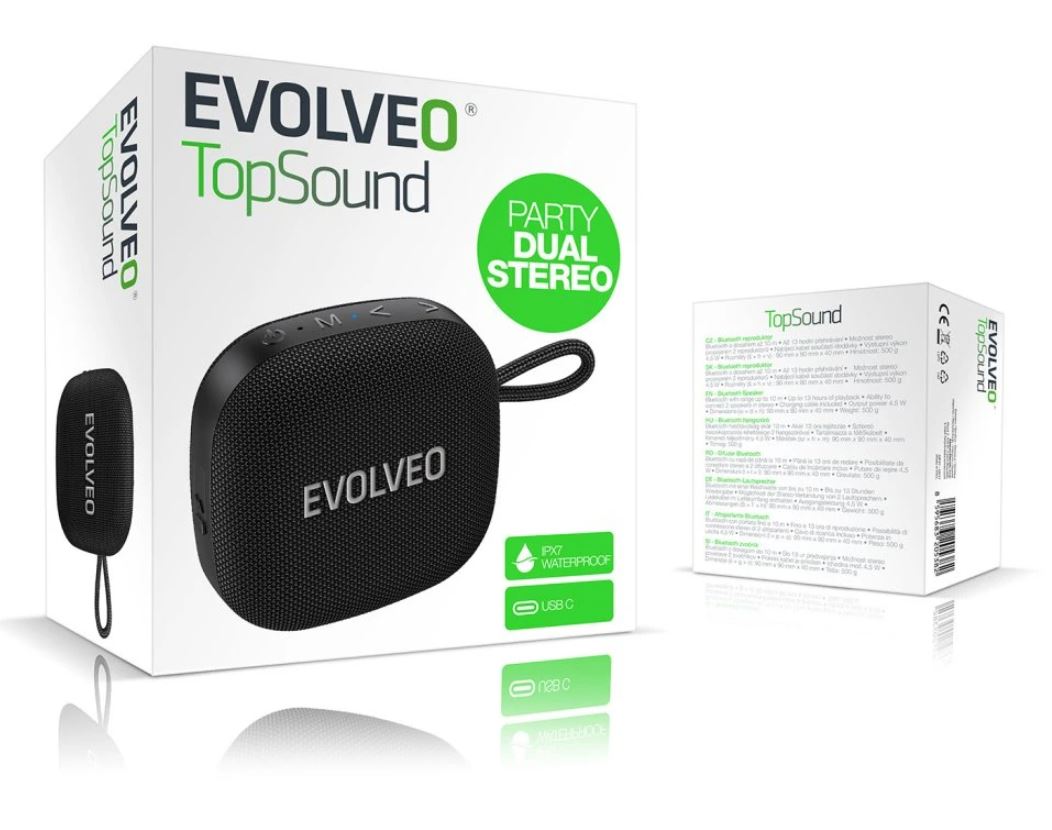 Představte si zařízení, které vám naservíruje skvělou muziku, kdykoliv na ni dostanete chuť. V pohodlí domova, venku za deště i při lenošení na pláži. EVOLVEO TopSound to zvládne s noblesou sobě vlastní. Tento bezdrátový vodotěsný reproduktor s rádiem je zkrátka hudebním parťákem, který vám nikdy neřekne ne – rozeznít vaše oblíbené melodie a zlepšit vám náladu je připraven vždy a všude.