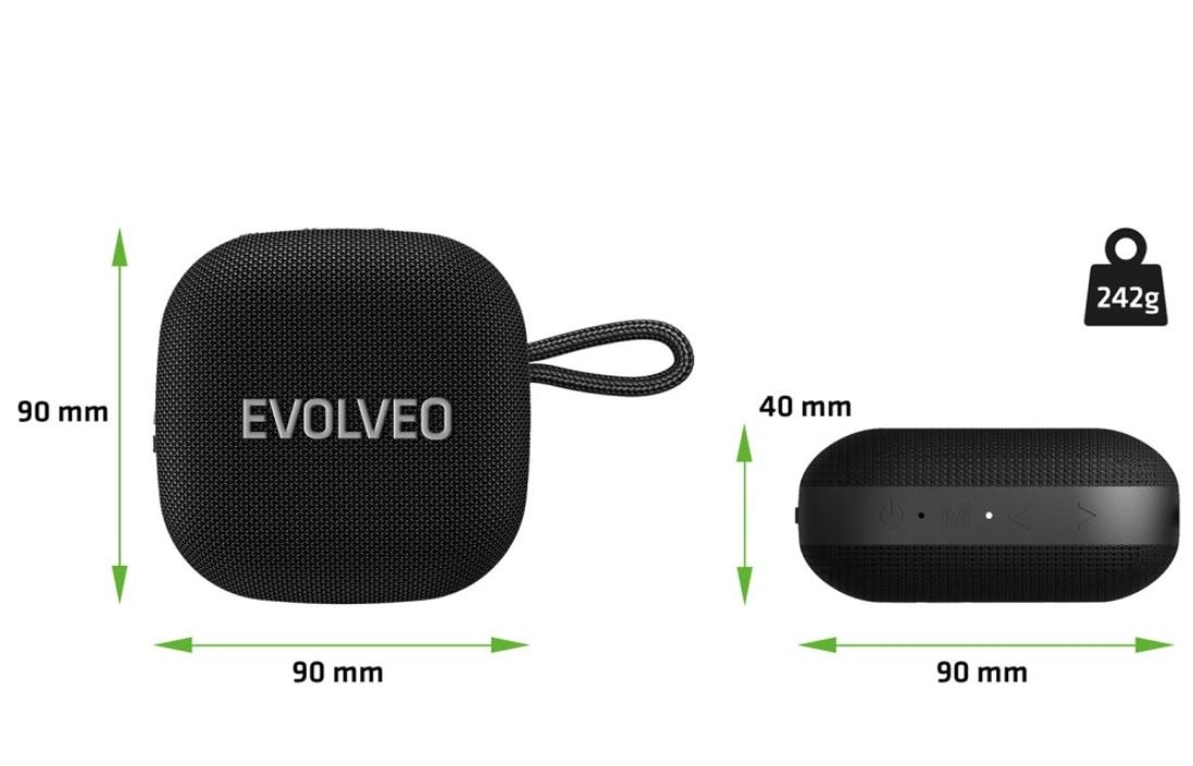Kompaktní zpracování s minimální hmotností a menšími rozměry (90 × 40 × 90 mm) dělá z reproduktoru EVOLVEO TopSound ideálního cestovního parťáka, který se vám vejde prakticky kamkoliv. Pět gumových protiskluzových žeber na spodní straně navíc zajišťuje, že reproduktor zůstane tam, kde ho potřebujete, i když hudba rozvibruje celý stůl. A zásluhou praktického poutka můžete reproduktor jednoduše někam zavěsit nebo ho pohodlně přenášet. Prostě ho čapnete za poutko a jdete i se svou milovanou muzikou, kam vás nohy ponesou.