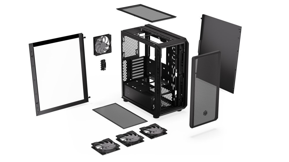 Vložili jsme do něj naše nejlepší řešení (včetně 4 Stratus 140 PWM ARGB). Výsledkem je, že si na stůl položíte jednu z největších skříní ENDORFY (je to 486×228×429 mm, což je o něco málo kratší než řada Arx 700) – s dostatečným prostorem pro umístění vysokého chladicího systému (až 179 mm), 7 ventilátorů a většina grafických karet (až 350 mm). Exteriér také vypadá cool – s tvrzeným sklem okna a jemně perforovanými ocelovými panely (přední a horní), které fungují jako filtry, je náš Arx 500 ARGB opravdovou krásou.
