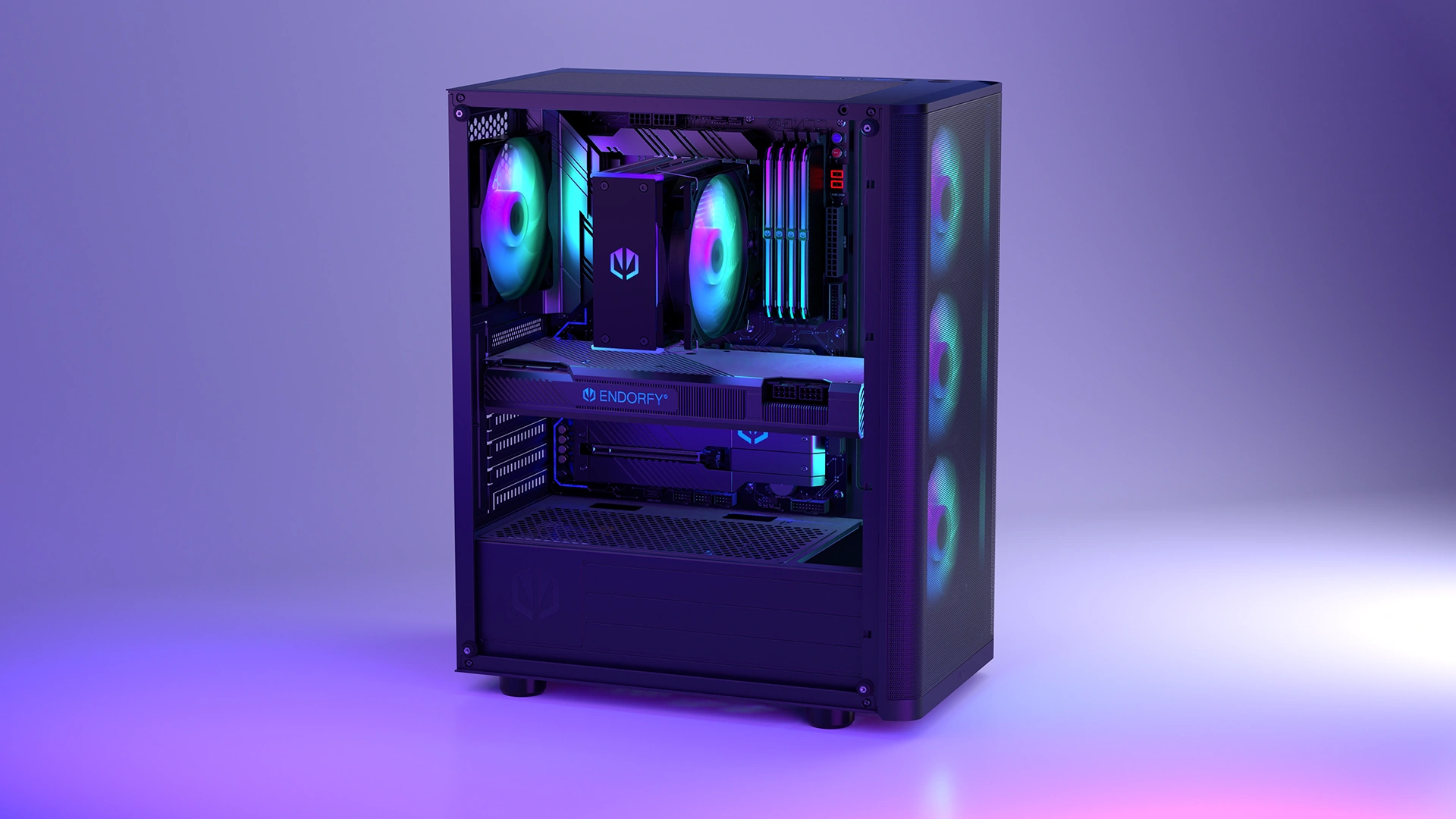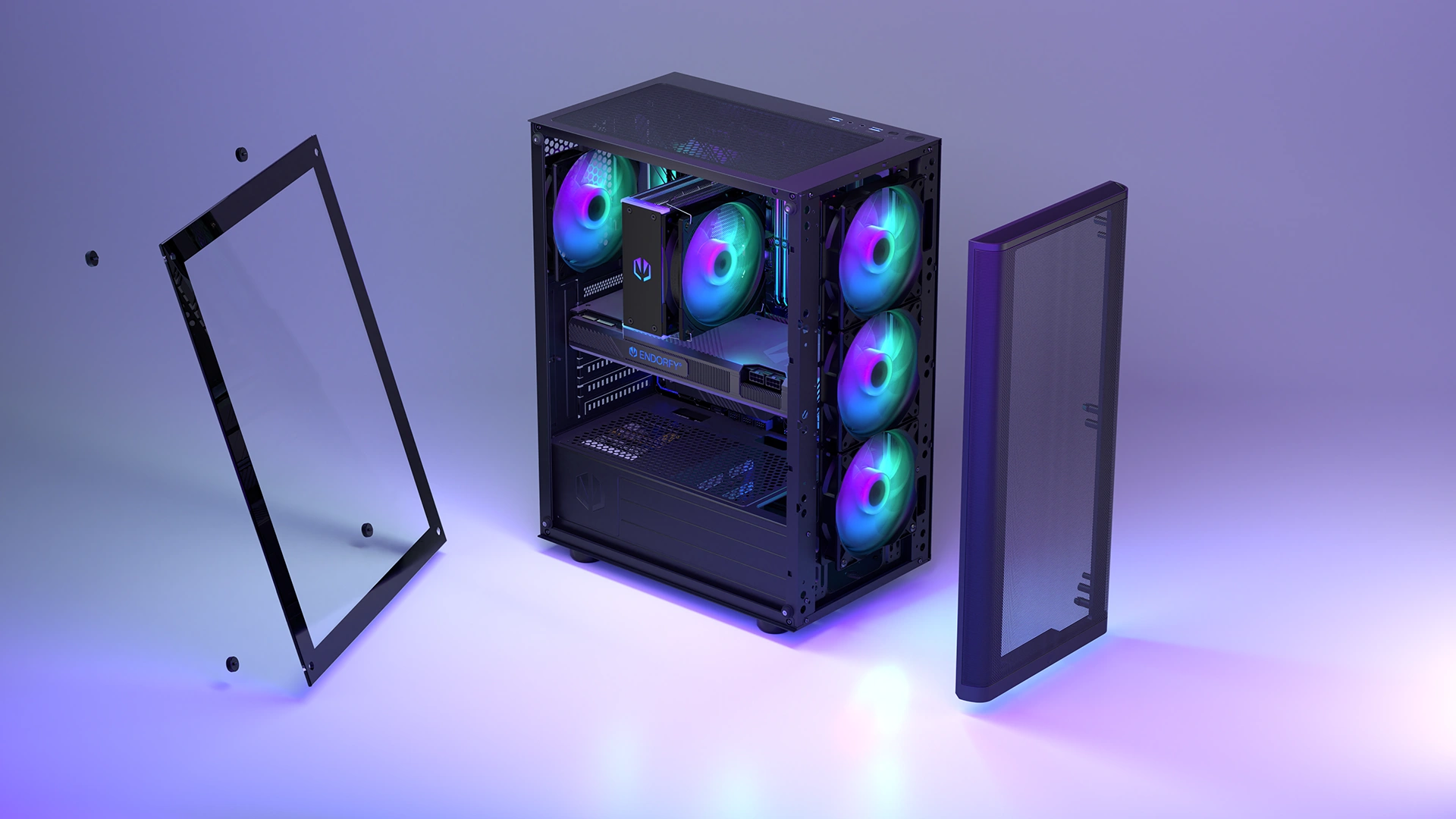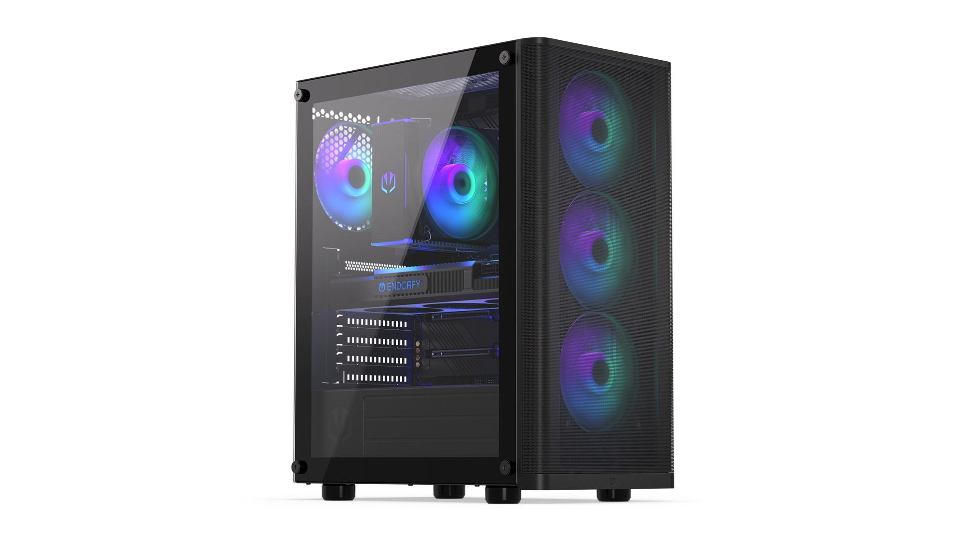 Počítačová skříň mimo jiné pojme základní desku formátu full ATX a 3 2,5„ disky (nebo 1 3,5“ a 2 2,5" disky). Kromě toho budete moci osadit systém kapalinového chlazení s 360mm radiátorem na předním panelu a 240mm radiátorem na horním panelu. Je zde také místo pro 7 ventilátorů - včetně 4 ventilátorů Stratus 120 PWM ARGB, které dostanete pro začátek - s rozdělovačem PWM je můžete ovládat z jediného konektoru základní desky.