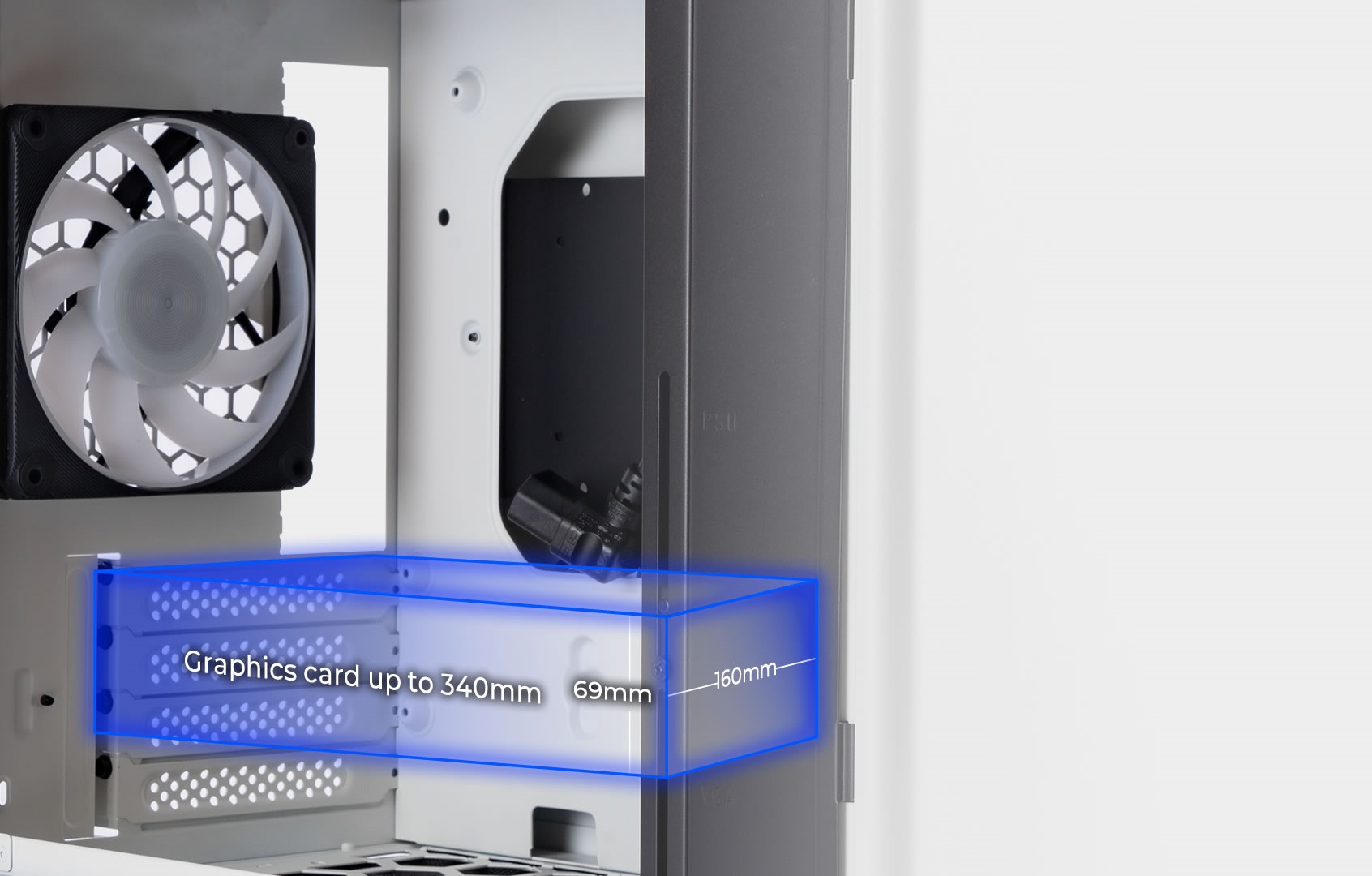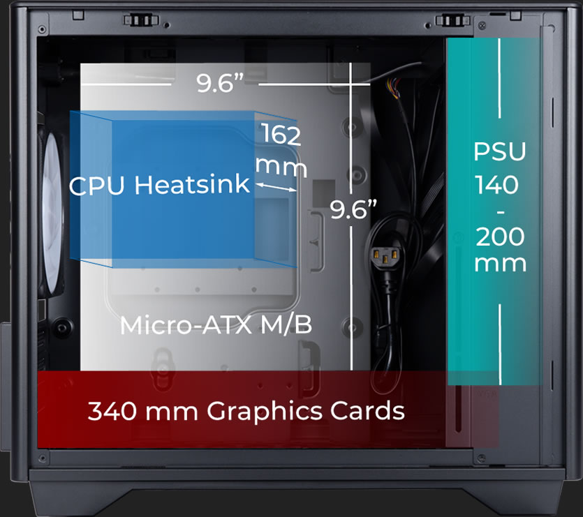 Maximální délka PSU: 140-200mm (pokud je PSU delší než 170mm bude nutné použít s GPU 280mm nebo kratší)