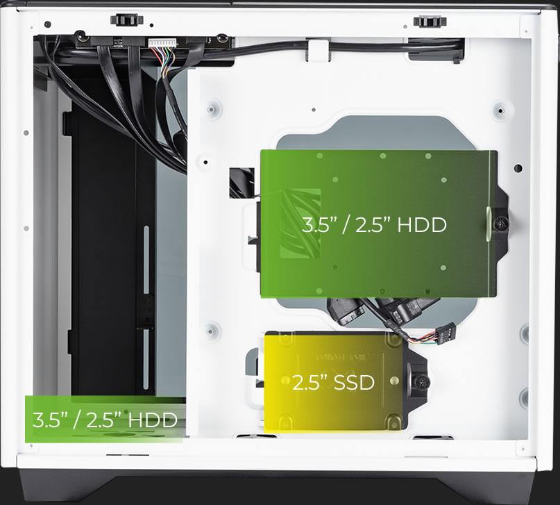 A3 podporuje vĂce 2,5" / 3,5" ĂşloĹľnĂ˝ch zaĹ™ĂzenĂ. SkĹ™ĂĹ nabĂzĂ strategicky umĂstÄ›nĂ© kanály za pĹ™ihrádkou základnĂ desky pro ÄŤistou a snadnou správu kabelĹŻ.