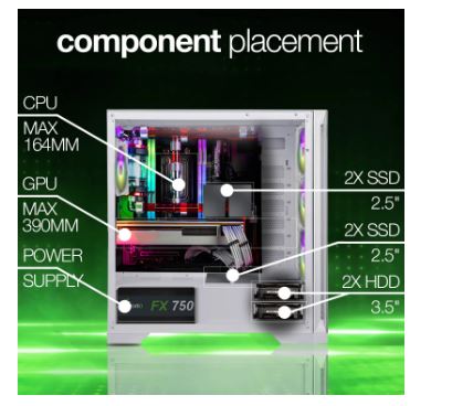 Vnitřní prostor této herní počítačové skříně je navržen tak velkoryse, že může být základem i pro ty nejambicióznější počítačové sestavy. Chladič procesoru může měřit až 164 mm na výšku. Grafická karta se sem vejde v délce až 390 mm. A pro ukládání dat je k dispozici místo pro 2 klasické pevné disky (3,5") a 3 moderní rychlá SSD úložiště (2,5"). Každá hardwarová součástka je zkrátka v této digitální pevnosti vítaným hostem a dostane se jí péče jako na císařském dvoře. Roli přitom nehraje ani její urozený původ – do skříně se dají vložit základní desky Intel i AMD, přičemž jsou podporovány formáty ATX, eATX (Extended ATX), mATX (Micro ATX) i mITX (mini ITX).