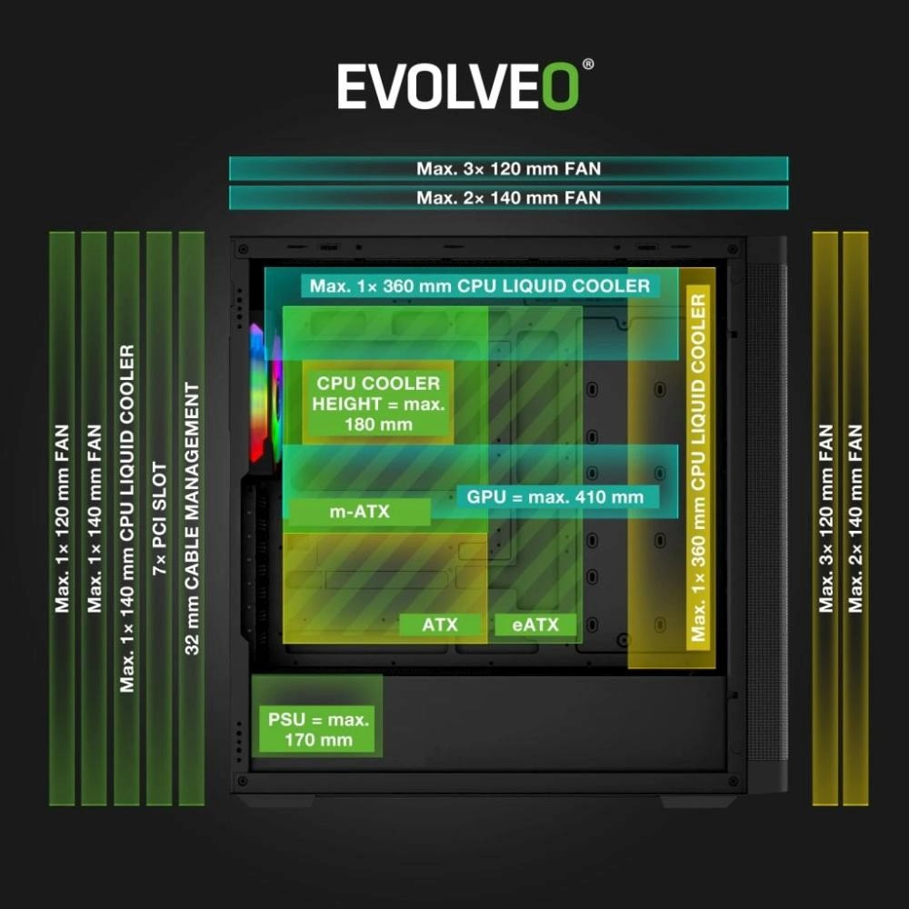 V počítačové skříni EVOLVEO Scorpio-BK-4 je dostatek místa na všechno, co má nadupaná herní mašina mít. Vejde se sem až 415mm grafická karta, chladič procesoru o výšce až 180 mm i všechny potřebné disky – ve skříni jsou 4 pozice pro 3,5" HDD a 5 slotů pro 2,5" SSD. Nic vám tak nebrání sestavit si počítač, jehož hardware hraje první ligu. O to, aby vnitřek skříně působil čistě a profesionálně, se navíc stará 32mm Cable Management pro skrytí kabeláže.