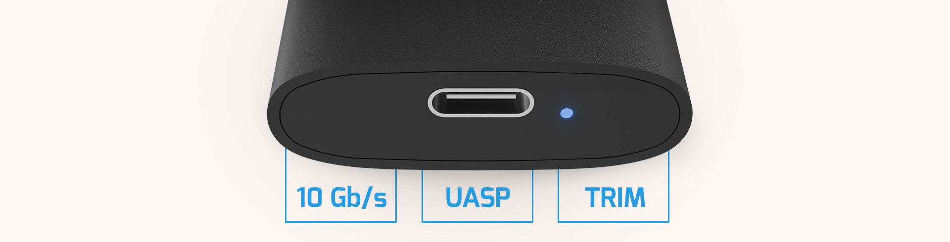 Díky rozhraní USB-C 3.2 Gen 2 x 1 se nemusíte obávat o rychlost přenosu dat. Může dosáhnout až 10 Gb/s. Vysoký výkon zaručuje také příkaz TRIM a protokol UASP, který umožňuje zařízení USB vykonávat několik příkazů současně, aniž by některý z nich vypadl.
