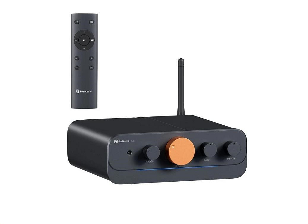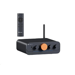 Vícekanálový zesilovač s DAC a LED indikací v celokovovém těle. Nabízí až 5kanálový výstup (4.1 / 5.0). Výkon 5x 50W/4x 60W @ 4?. THD ? 0,03 %, SNR ? 88 dB, impedance 4–8 ?. Vstupy: Bluetooth, 3,5 mm AUX a optický. Výstup pre-out. Korekce basů a výšek, přepínání režimů. Rozměry 155 × 183 × 51 mm. Součásti balení: BT anténa, napájecí kabel, 3,5mm kabel, dálkový ovladač, uživatelský manuál..
