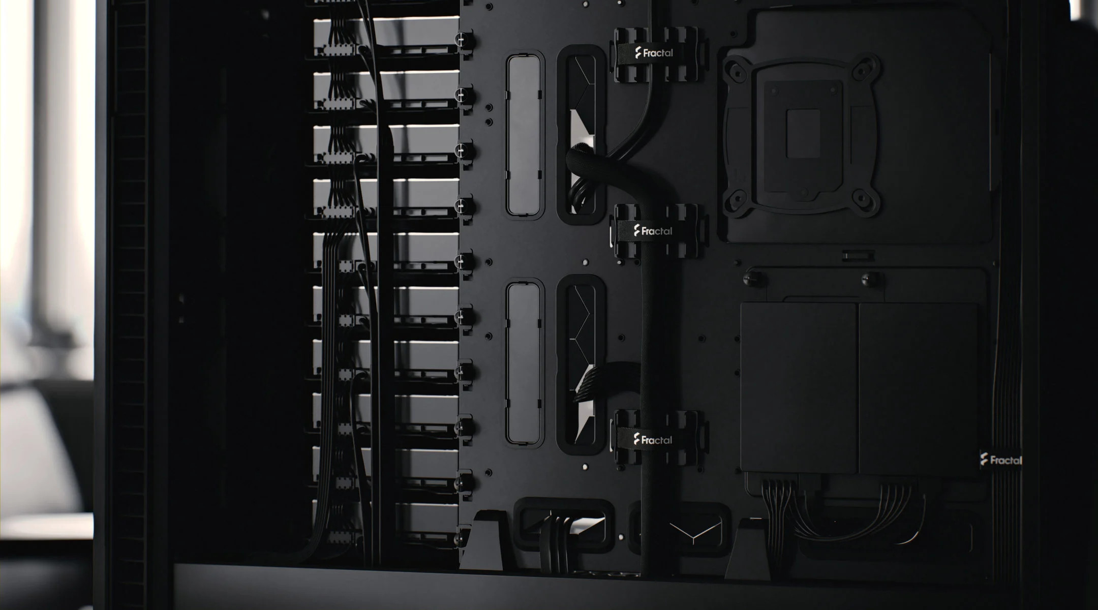 Odnímatelné stínění kabelů PSU a integrované vedení kabelů s pásky na suchý zip dále zjednodušují správu kabelů za deskou.
