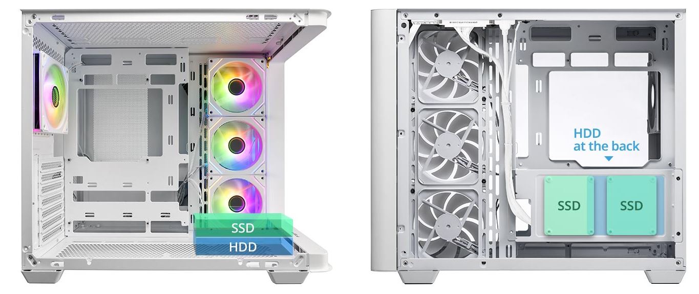 Boční strana je vybavena trojicí reverzních ARGB ventilátorů s PWM regulátorem, zatímco zadní strana je vybavena PWM ARGB ventilátorem.