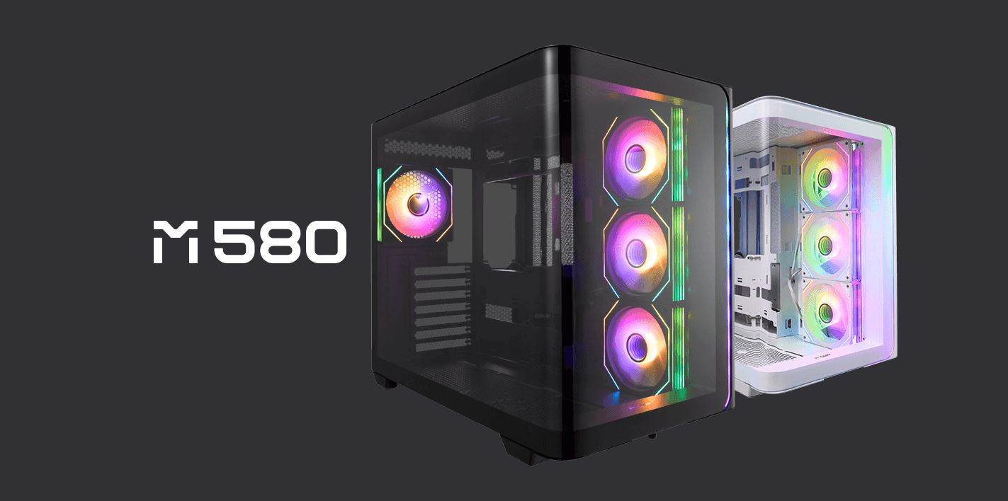 Skříň M580 podporuje základní desky ATX (se zadním připojením), M-ATX a Mini-ITX a pojme grafické karty o průměru až 445 mm a chladič o průměru až 360 mm, čímž poskytuje flexibilitu pro pohlcující a neomezené herní zážitky.