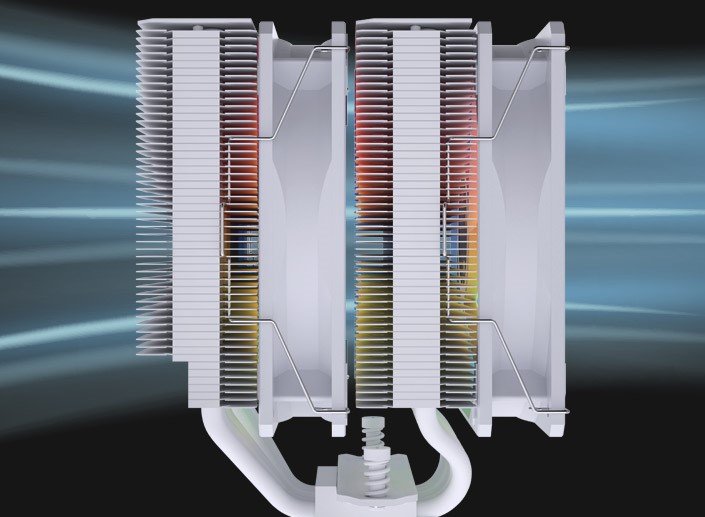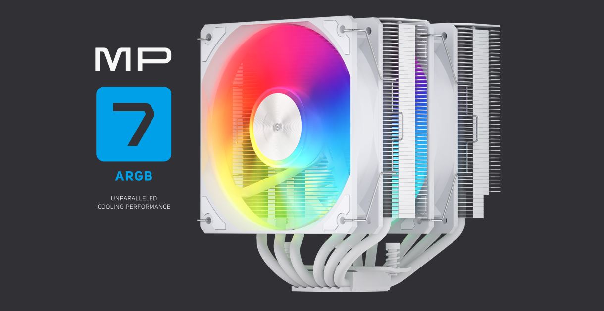Model MP7 je vybaven dvěma chladiči a dvěma 120mm ventilátory pro maximalizaci tepelného výkonu, což z něj činí ideální volbu pro hráče a overclockery, kteří vyžadují vysoce výkonné chlazení pro extrémní tepelné zatížení.