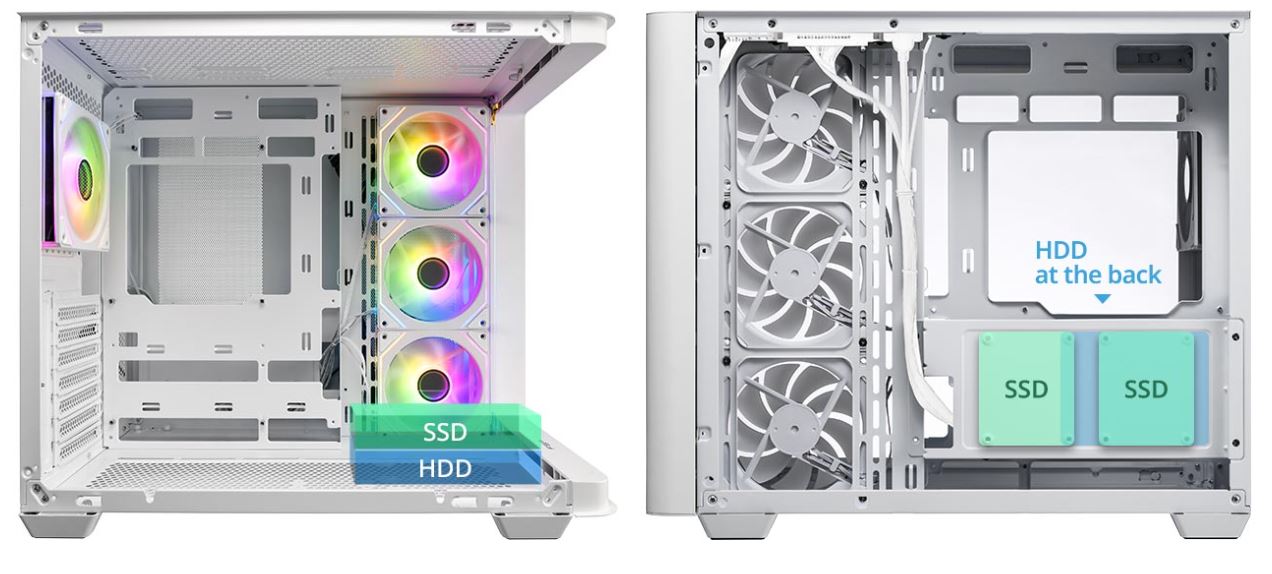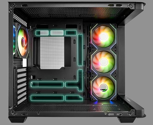 Boční strana je vybavena trojicí reverzních ventilátorů ARGB s PWM regulátorem, zatímco zadní strana je vybavena ventilátorem ARGB s PWM.