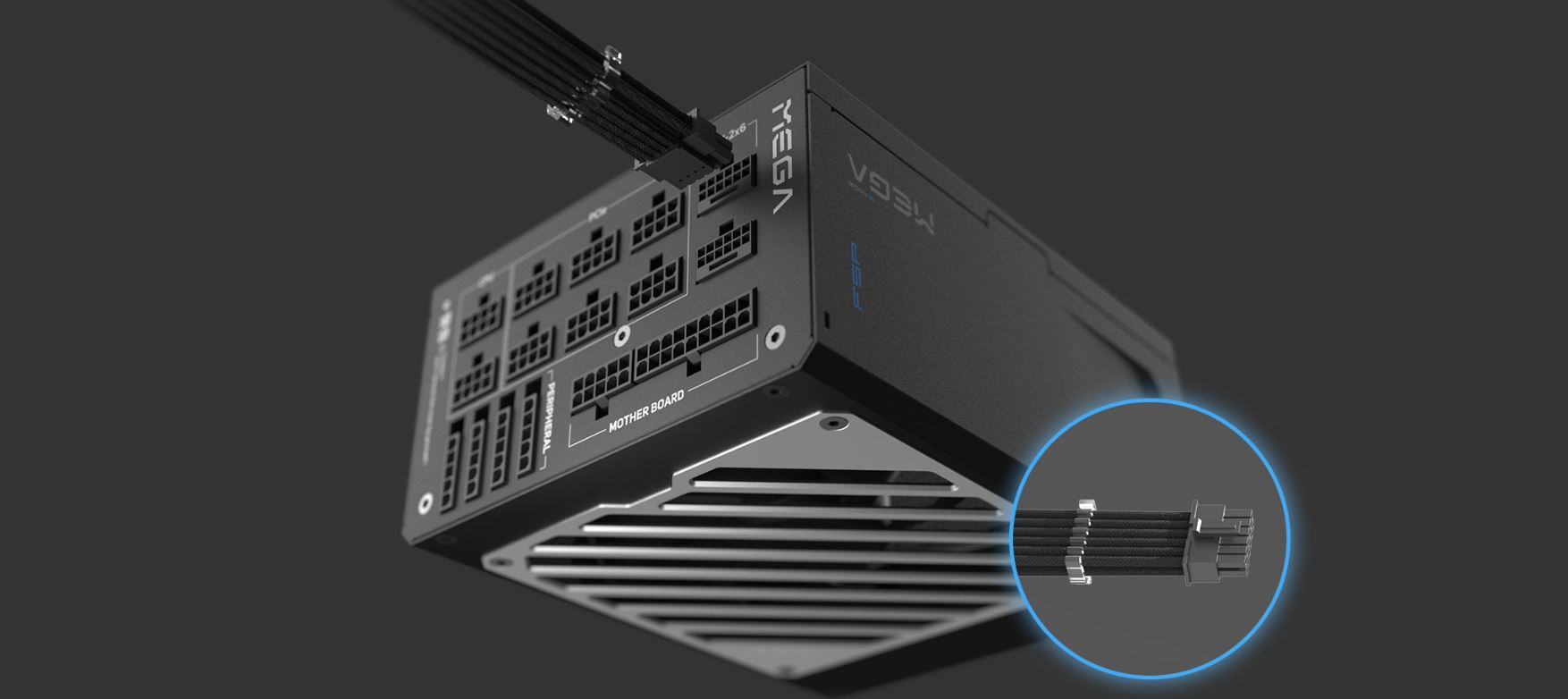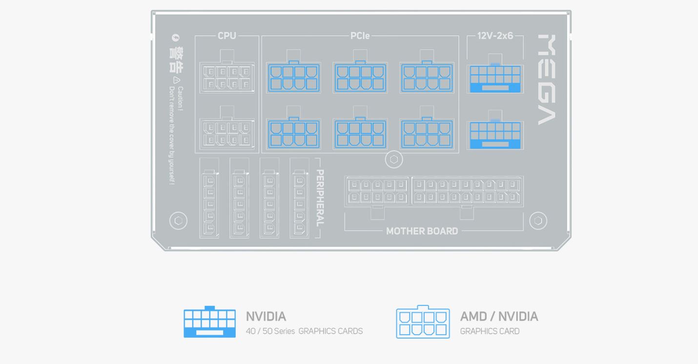 DĂky univerzálnĂm 8pinovĂ˝m konektorĹŻm PCIe a nativnĂm konektorĹŻm 12V-2x6 poskytuje Ĺ™ada MEGA TI bezkonkurenÄŤnĂ flexibilitu v konfiguracĂch napájenĂ.