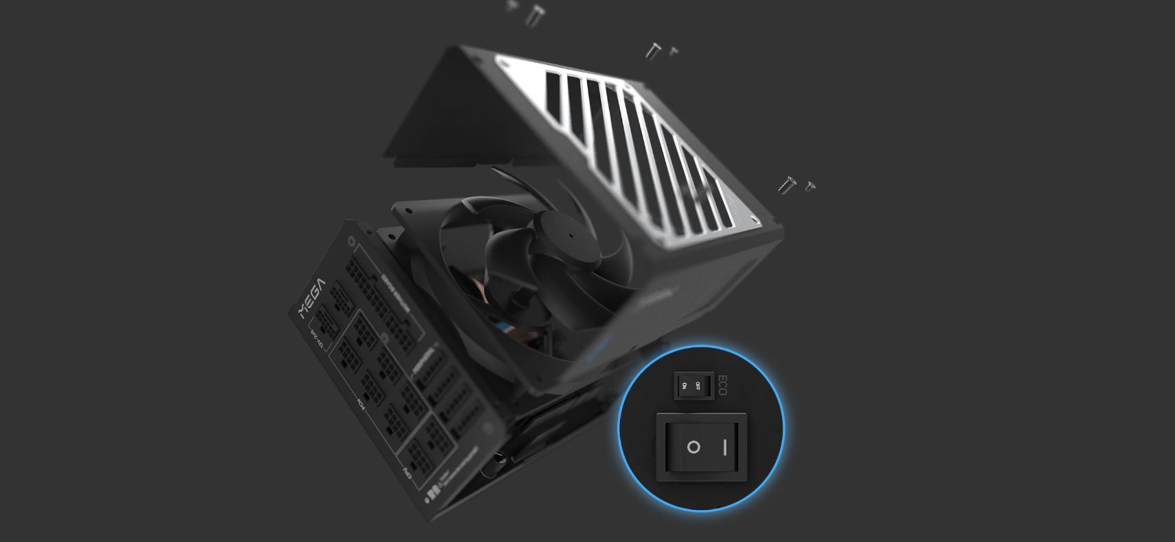 Vypínač „Eco Switch“ umožňuje zdroji pracovat tišeji a s nižší spotřebou energie. Pokud je zatížení zdroje menší než 40 %, zdroj přejde do tichého módu a ventilátor se vypne.