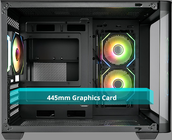 Kompatibilní se základními deskami Micro ATX a Mini-ITX, podporuje až 445mm grafické karty a 160mm chladiče CPU, takže si můžete vychutnat neomezený herní zážitek.