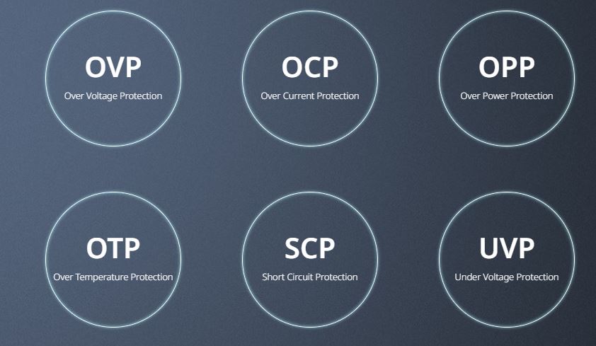 * kompletní ochrana: OCP, OVP, SCP, OPP, UVP, OTP