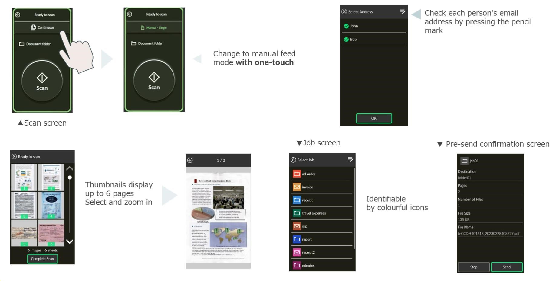 Software | PaperStream Capture PaperStream ClickScan PaperStream ClickScan Searchable PDF Option Software Operation Panel Error Recovery Guide Scanner Central Admin Agent Network Setup Tool for fi Series fi Series Online Update ABBYY FineReader for ScanSnap (available as download) | |