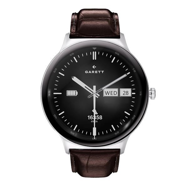 - Sada obsahuje: smartwatch GARETT, náhradní kožený řemínek (černý / hnědý dle varianty), nabíjecí základna USB, QSG návod
