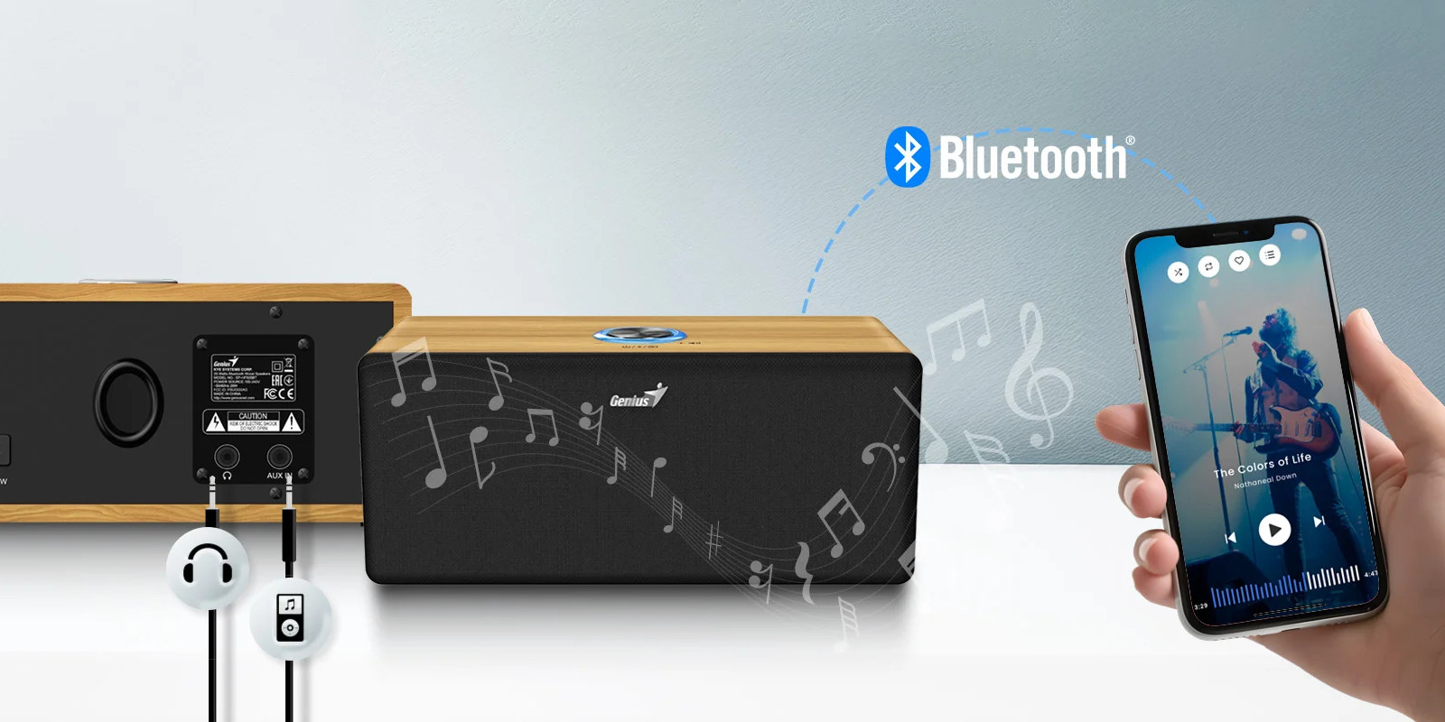 Více možností připojení přes Bluetooth 5.3, AUX nebo sluchátkový výstup pro flexibilní poslech.